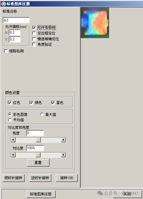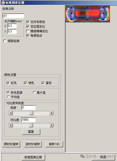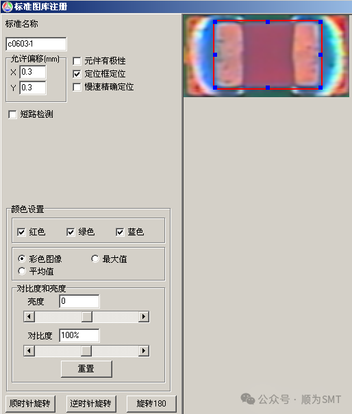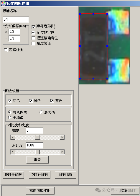 注:①若元件本身有極性,則在注冊標準時一定要選擇“元件有極性”,當元件的極性標志不明顯時(比如上述的玻璃二極管),一定要加上“角度驗證”。角度驗證:判別一些極性標志不是很明顯的小零件的極性的常用方法,保險起見我們通常對這類零件注冊標準時加上角度驗證。注意加角度驗證的標準要先選中定位框框住元件本體定位,角度驗證只對定位框內的元件體起作用這樣檢測極性效果更好。