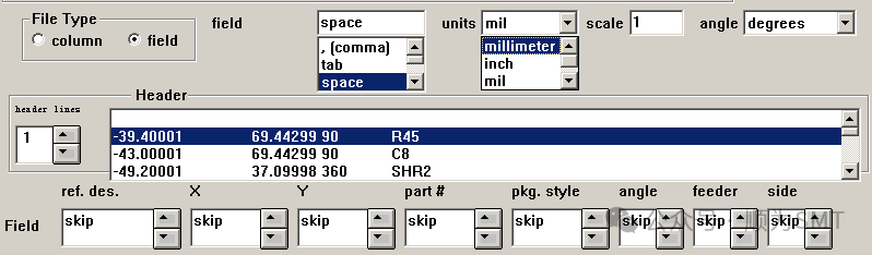 6.先擇Field中點選“space”Units中點選“Millimeter”,在Field中,ref“位號”,X“X坐標”Y“Y坐標” angle“角度”Side“正反面”