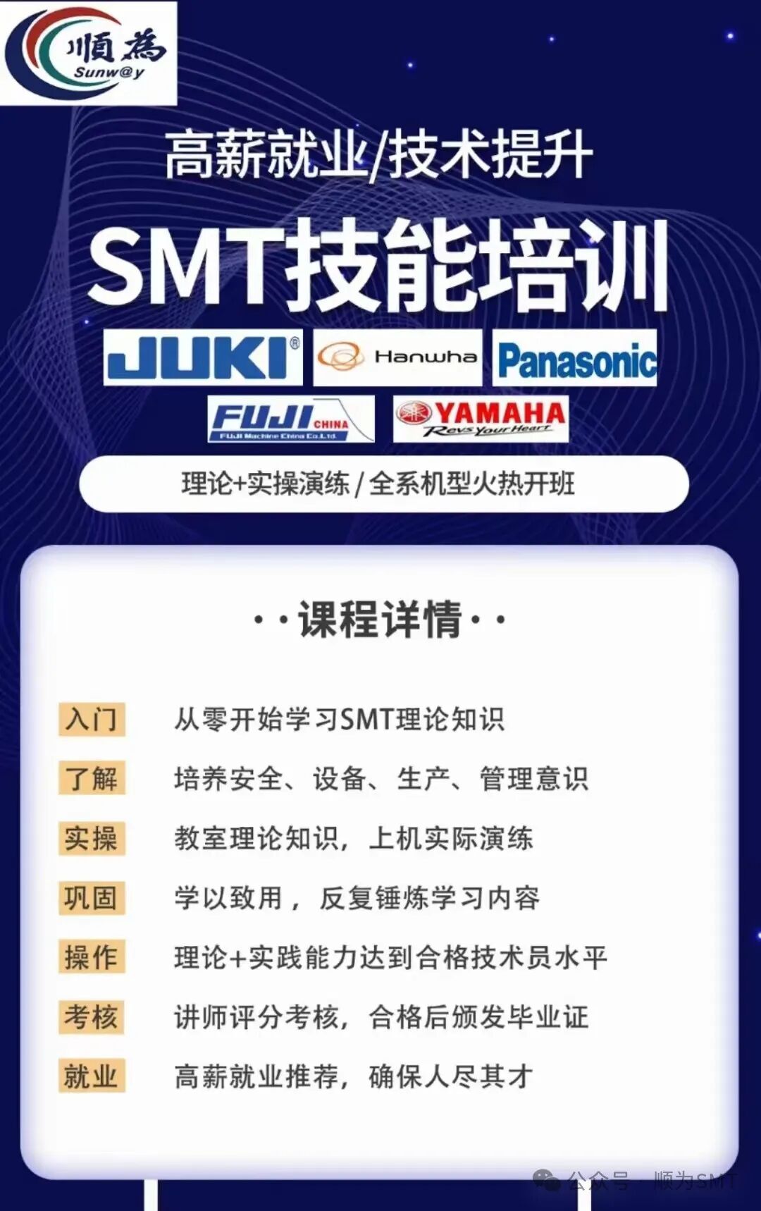 ?課程內容包含:選擇一款品牌貼片機;學在線編程,離線編程,元件(影像)制作,打膠紙板。包含周邊設備培訓:(印刷機,SPI,AOI)工藝流程講解,學員就業指導。